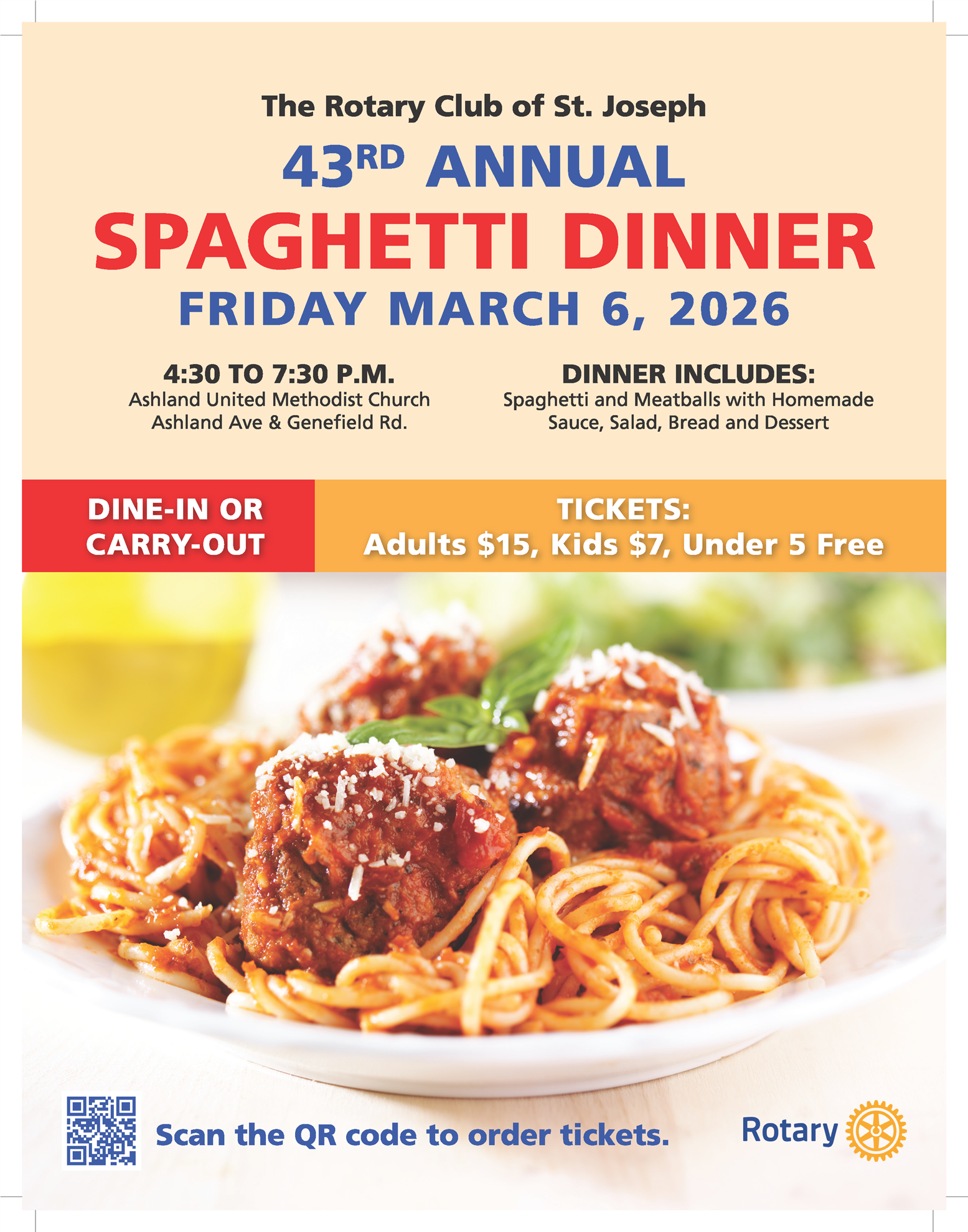 Tickets have also been distributed, along with sponsorship forms and lunch order forms. The tickets are $15 for all you can eat spaghetti, breadsticks, salad, and delicious desserts. Kids are $7, 5 and under are free. Carry-out lunches are $8 each.